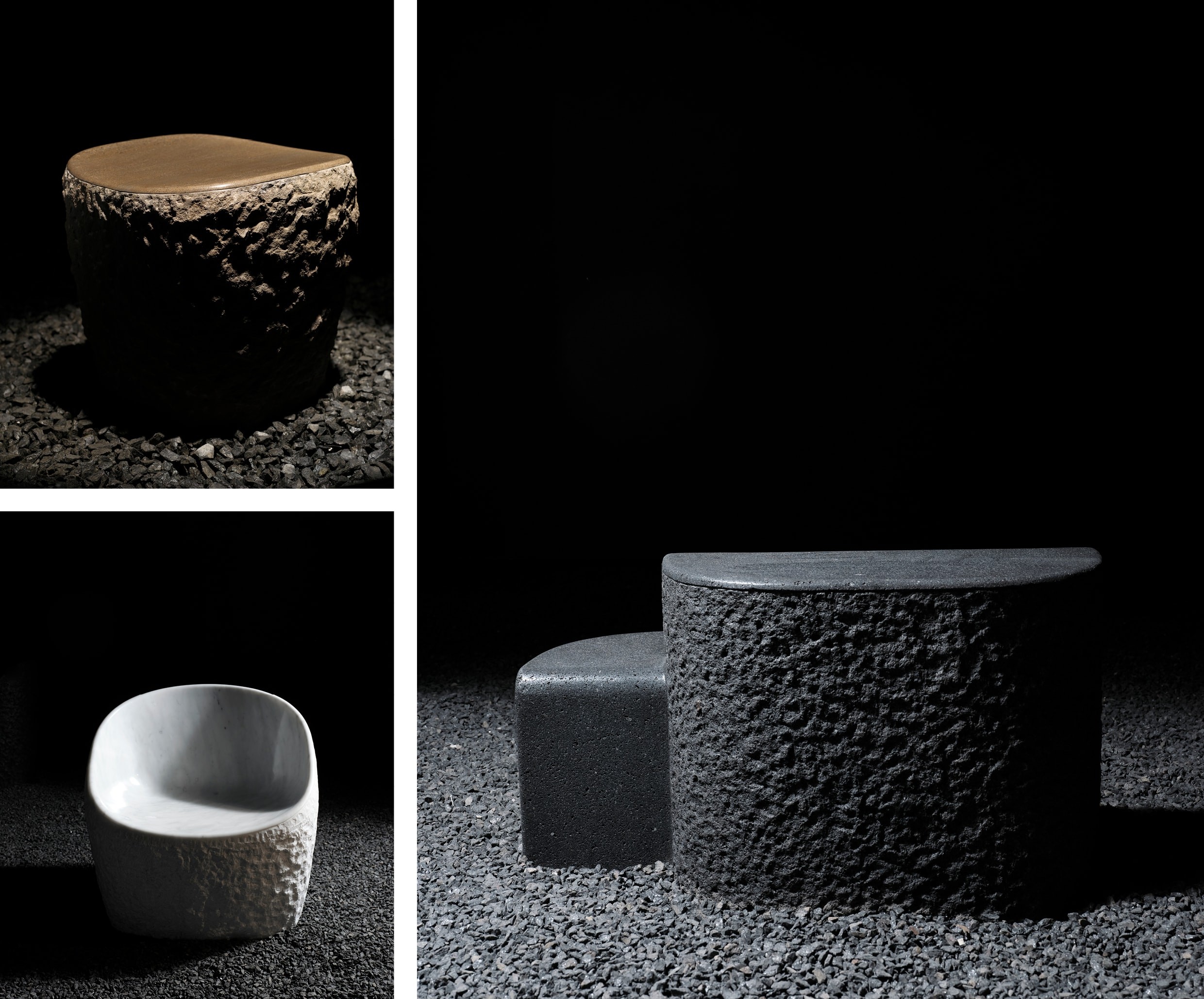 With this collection, the designer created a series of furniture pieces that balance mass and lightness. Chairs, tables, lounge furniture and columns are constructed from porphyry and Carrara marble from Italy, cafesina from Spain, and lava stone from Mexico. By placing rough and polished surfaces side by side, a tension is created that works both on a tactile and visual level. The objects show the stone in its purest state, without ornamentation or excess. ‘In this collection, the stone is the protagonist,’ says the designer.