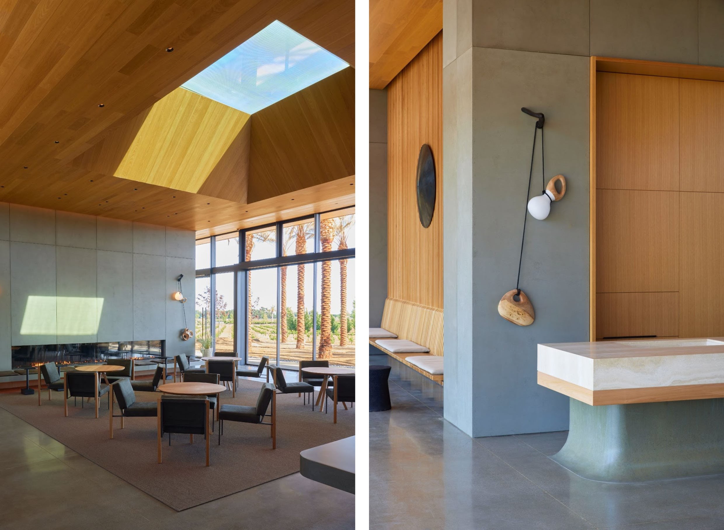The design of The Bureau celebrates the region's landscape and agriculture by using natural materials that evoke an earthy essence. The architecture, provided by Greg Mottola of Bohlin Cywinski Jackson, creates a visual and physical connection to the vineyards and mountains from every part of the building. The modern design creates a new architectural language for the region.