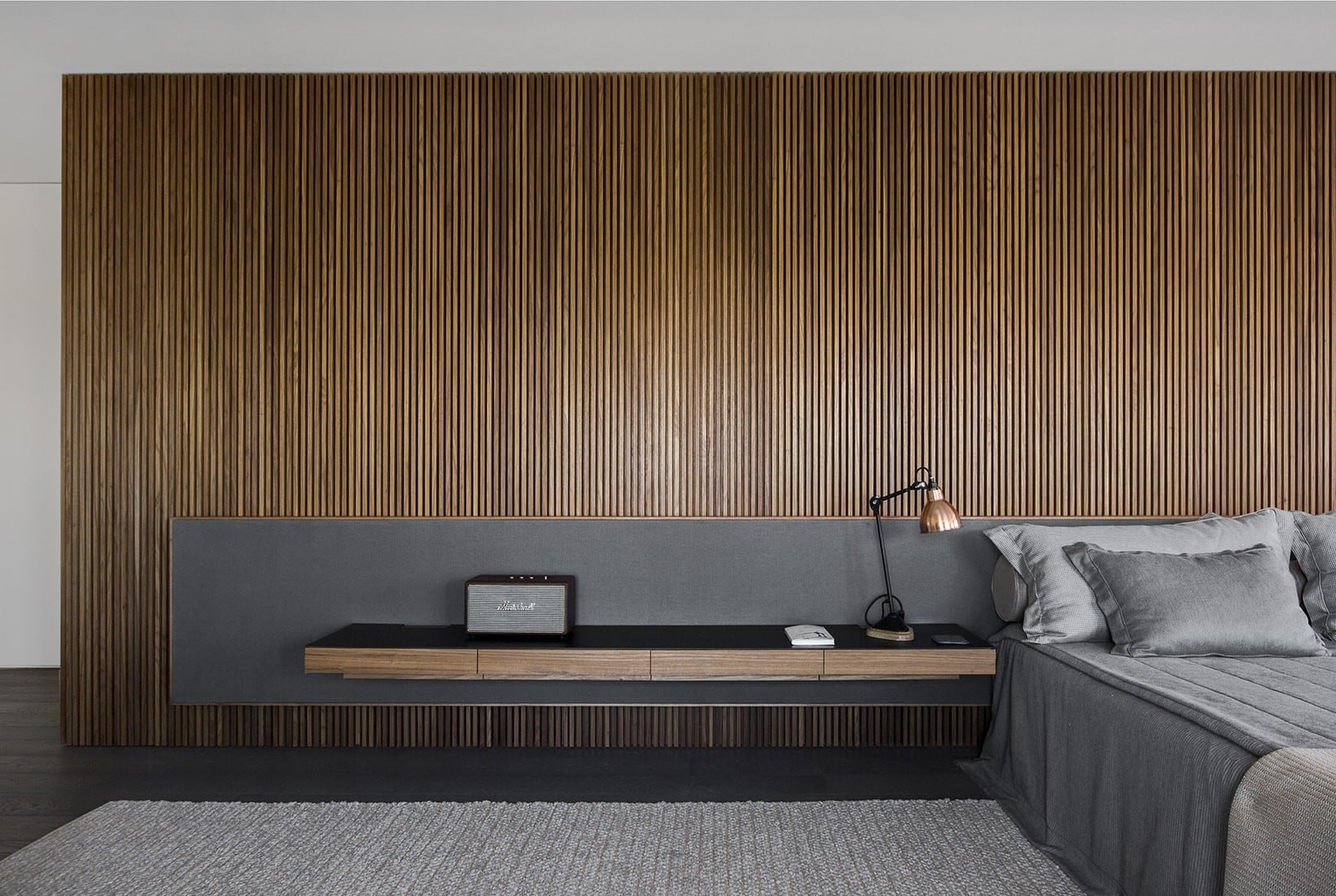 The colour palette of the house was kept very simple. Black and grey tones form a monotonous but warm whole that is complemented by the copper tones of the lamps above the dining table. Despite the dark, wooden ceiling and walls, there is still a lot of incidence of light through the large windows which restrains that you get an enclosed feeling. For the floor, a dark gray stone was chosen. In the living room it gets interrupted by a soft white carpet which illuminates the heavy feeling of the dark materials. Brazilian modernism in all its simplicity.