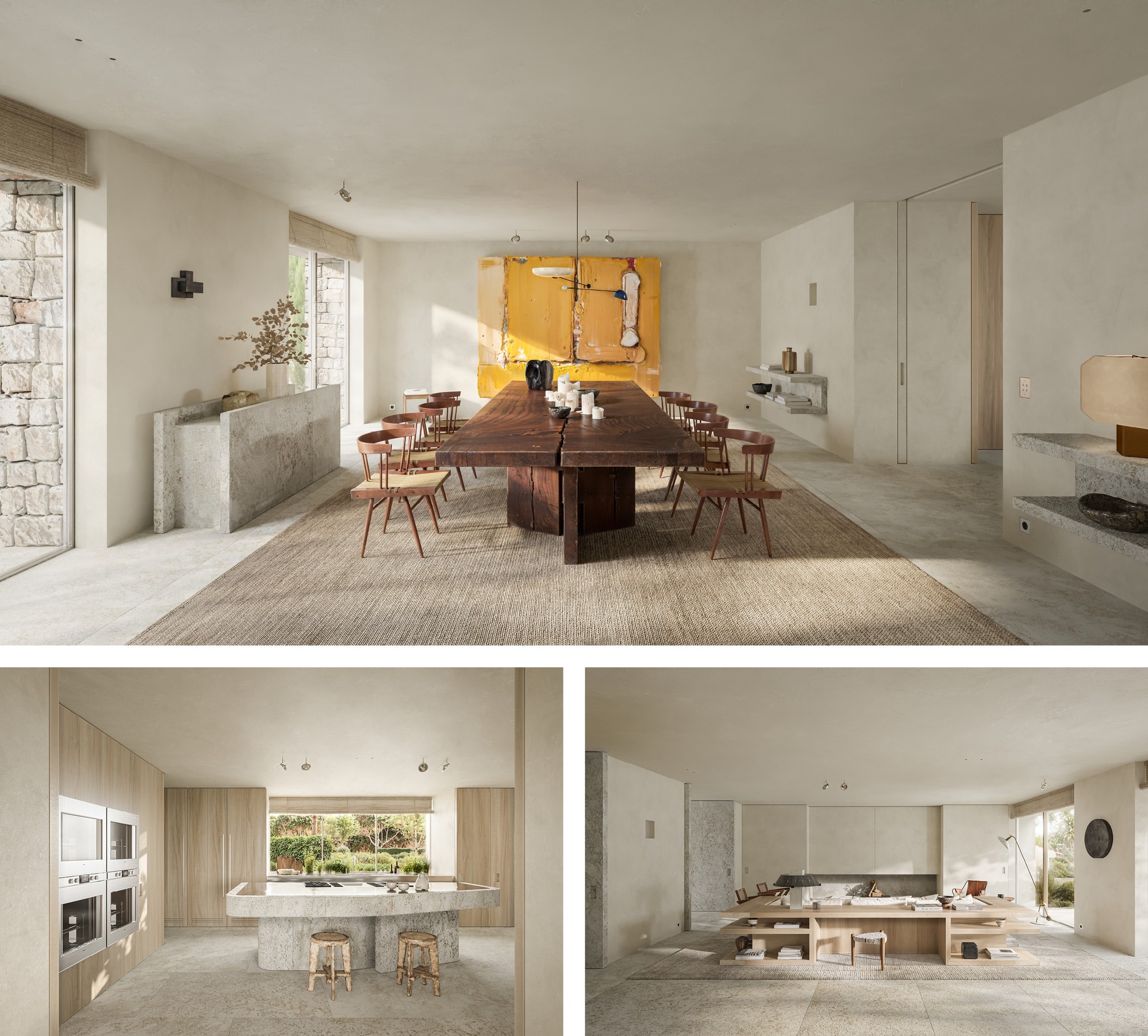 The materials strike a balance between tactility and timelessness. Natural tones dominate: soft limestone, brushed oak, subtle metal accents and a powdery palette that tempers the southern light. Reflective surfaces of tin and onyx capture the landscape and subtly bring it indoors. Everything is detailed with precision, without excess, a nod to maritime simplicity, translated into contemporary refinement. Inside, the understated atmosphere forms a backdrop for a careful selection of objects, art and vintage furniture. As a result, the house never feels finished, but lives with its residents. Architecture, interior and surroundings are not separate elements here, but links in a single coherent experience, calm, clear and lived-in. A home that does not try to impress, but gradually leaves an impression.