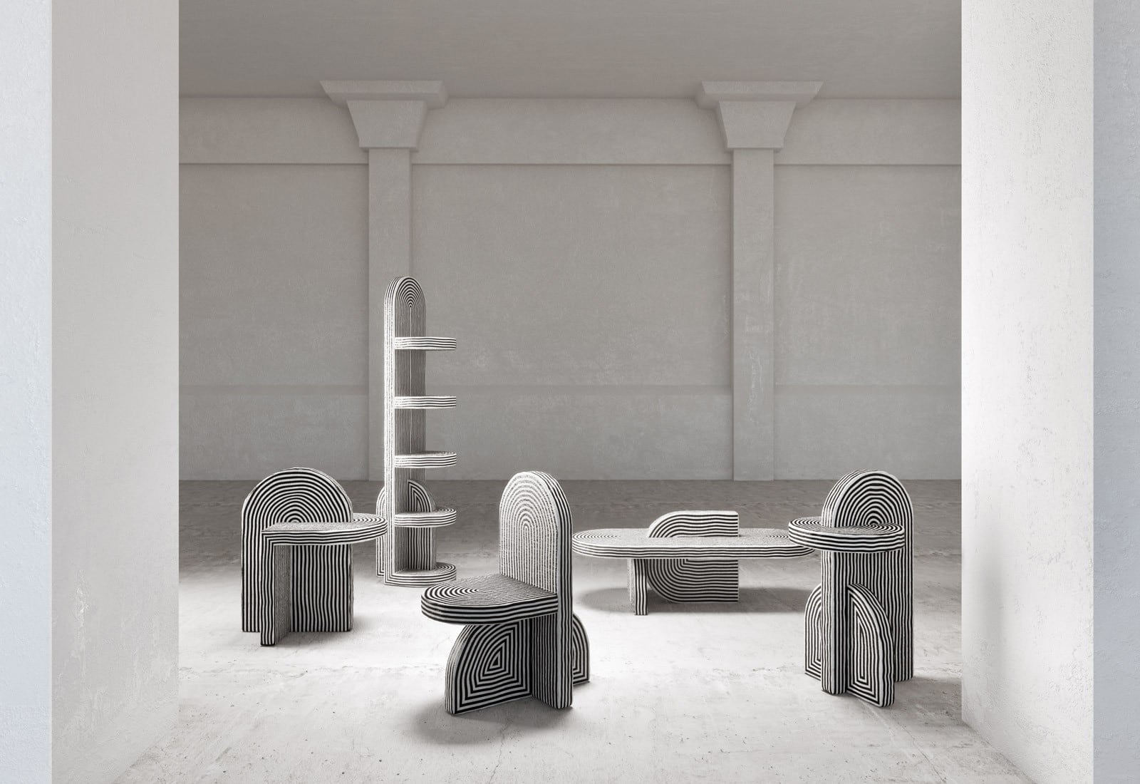 De zwart-witte kleur van de meubels verbeeldt een dualiteit. Zwart staat voor mysterie, terwijl wit sereniteit en onschuld betekent. Door deze tegenovergestelde kleuren naast elkaar te stellen wil Yasmine een interne en ruimtelijke chaos weergeven. Alle meubels zijn handgeschilderd en -gemaakt in verschillende materialen zoals schuim, lichtgewicht cementpleister, acryl en keramiek.