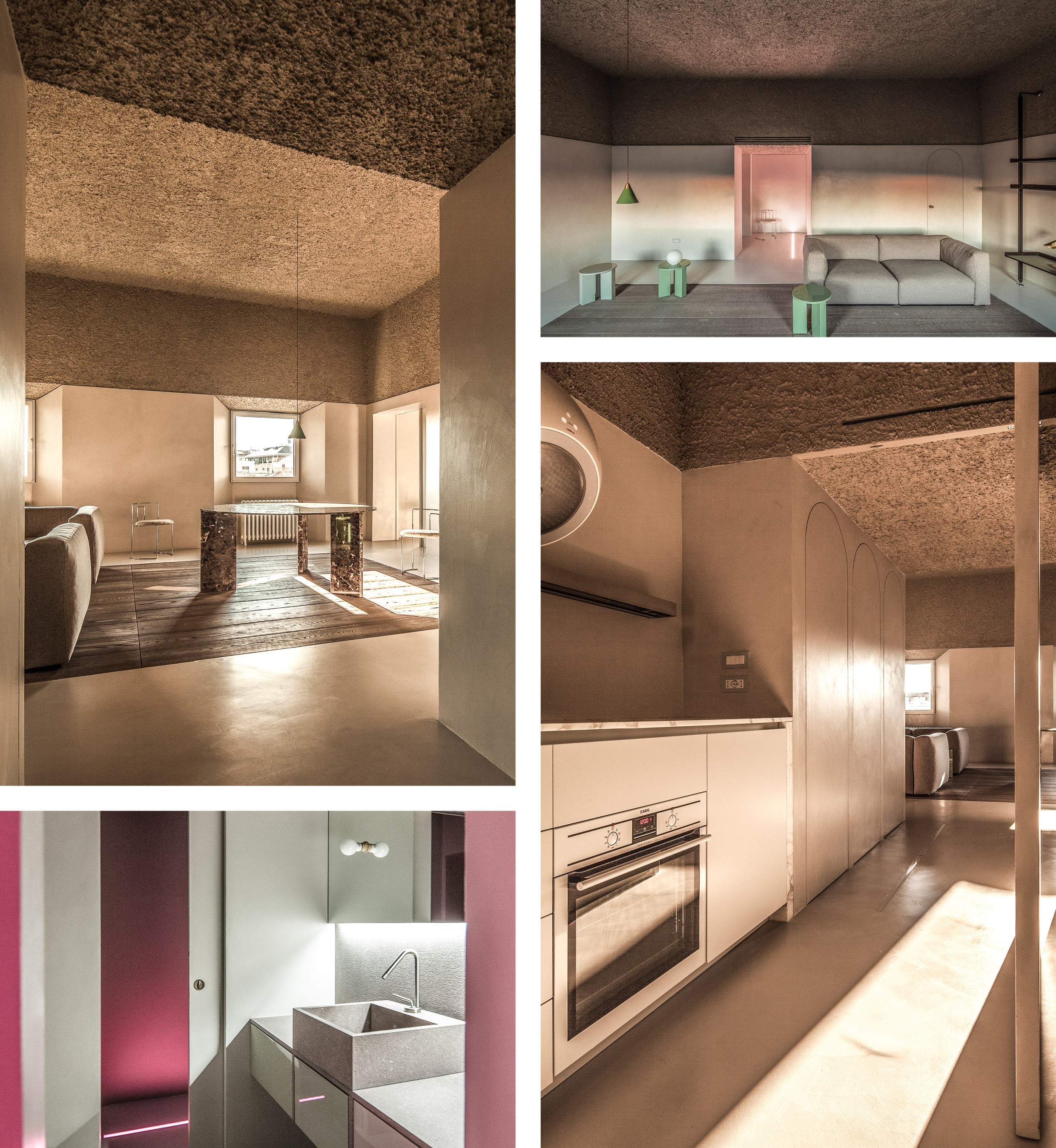 Dit huis is voor de architect een ode aan stof, wat hij in de verf zet door het gebruik van klassieke verhoudingen en de gulden snede. Het klinkt misschien wat onduidelijk, maar bij het zien van de beelden, voelen we wel de unieke sfeer die Antonino Cardillo hiermee beoogde. In de centrale ruimte, de woonkamer, bestaat het plafond uit rustiek pleisterwerk in aardetinten. Het moet een hunkering naar primordiale grotten voorstellen, met ramen die uit de basis zijn gegraven.