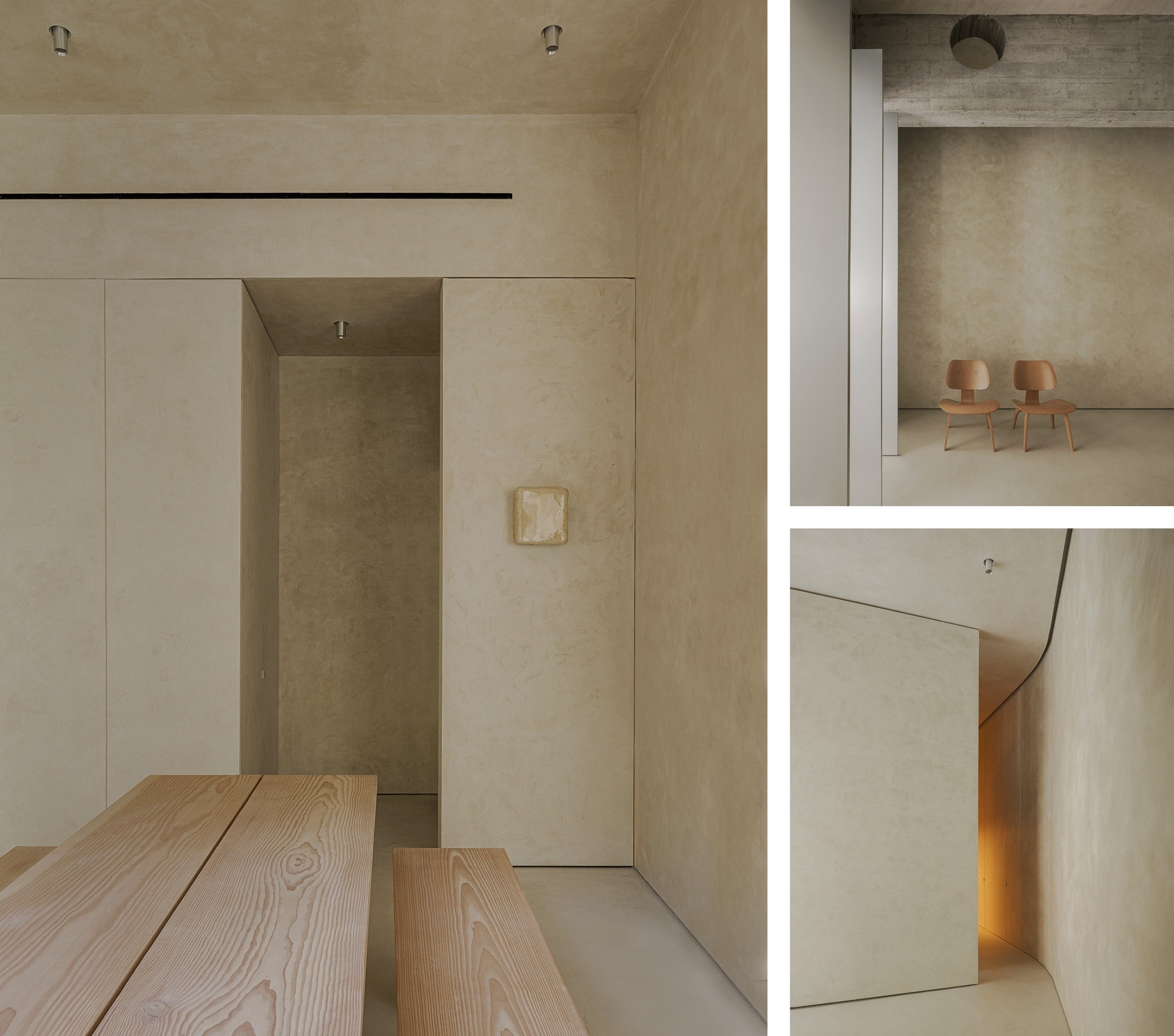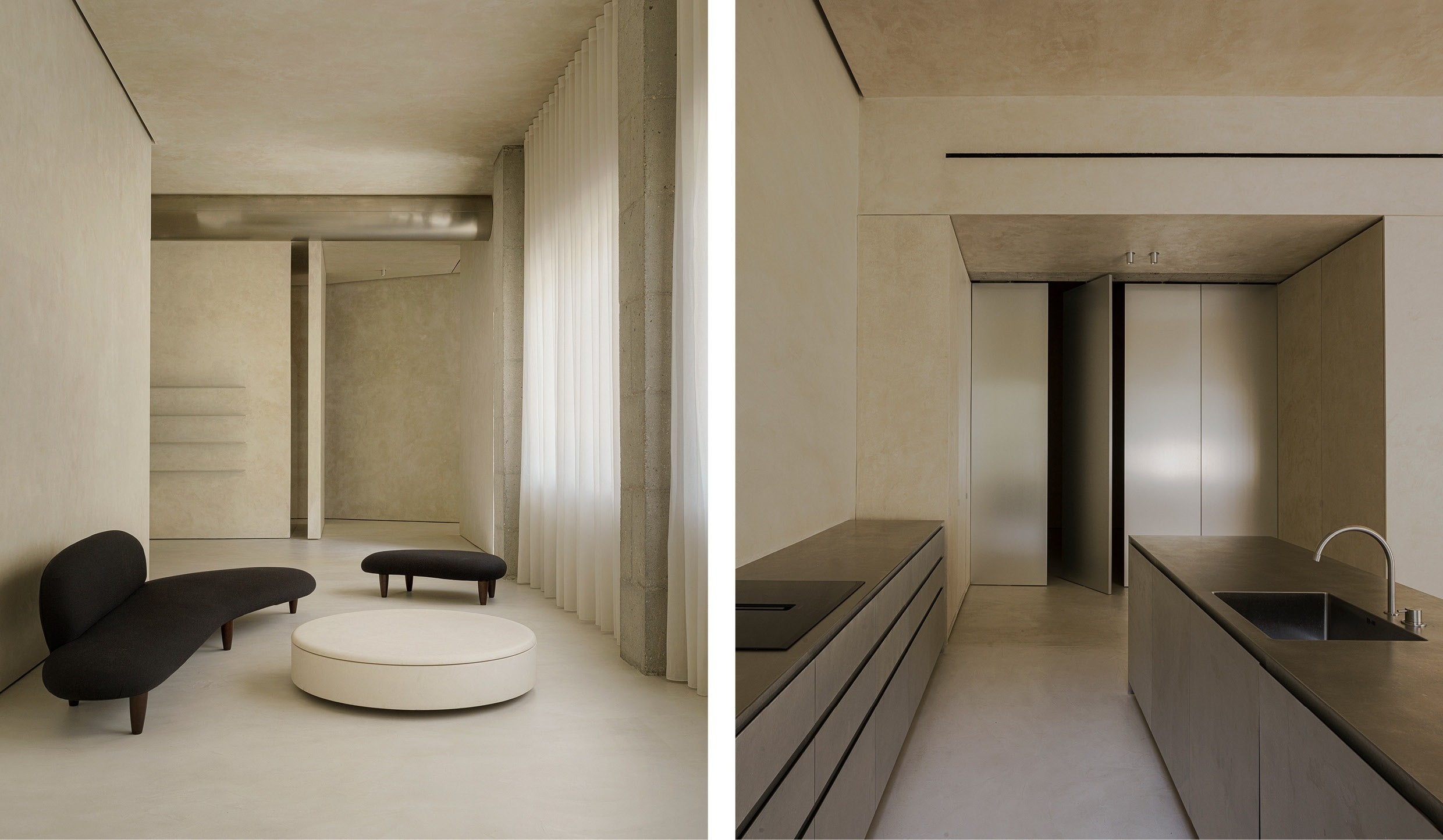 Het ontwerpproces begon met de sloop van het oorspronkelijke interieur, waardoor de betonnen structuur zichtbaar werd en een haast magische ruimte ontstond, badend in natuurlijk licht. Deze ruimte inspireerde de architecten om de tuin als de drijvende kracht achter het ontwerp te omarmen. De koelte en rust van het groen vullen het huis en versterken de beoogde verbondenheid met de omgeving, terwijl de interieurkeuzes de puurheid en de esthetische eenvoud van het ontwerp naar voren brengen. Gepolijste metalen, ambachtelijke texturen en meubels in hout en steen verlenen het interieur een ingetogen, maar indrukwekkend monumentale uitstraling. Het resultaat is een ruimte die een verfijnde warmte en een sculpturale gevoeligheid uitstraalt, waarin vorm en functionaliteit samensmelten tot een unieke, zelfbewuste esthetiek.