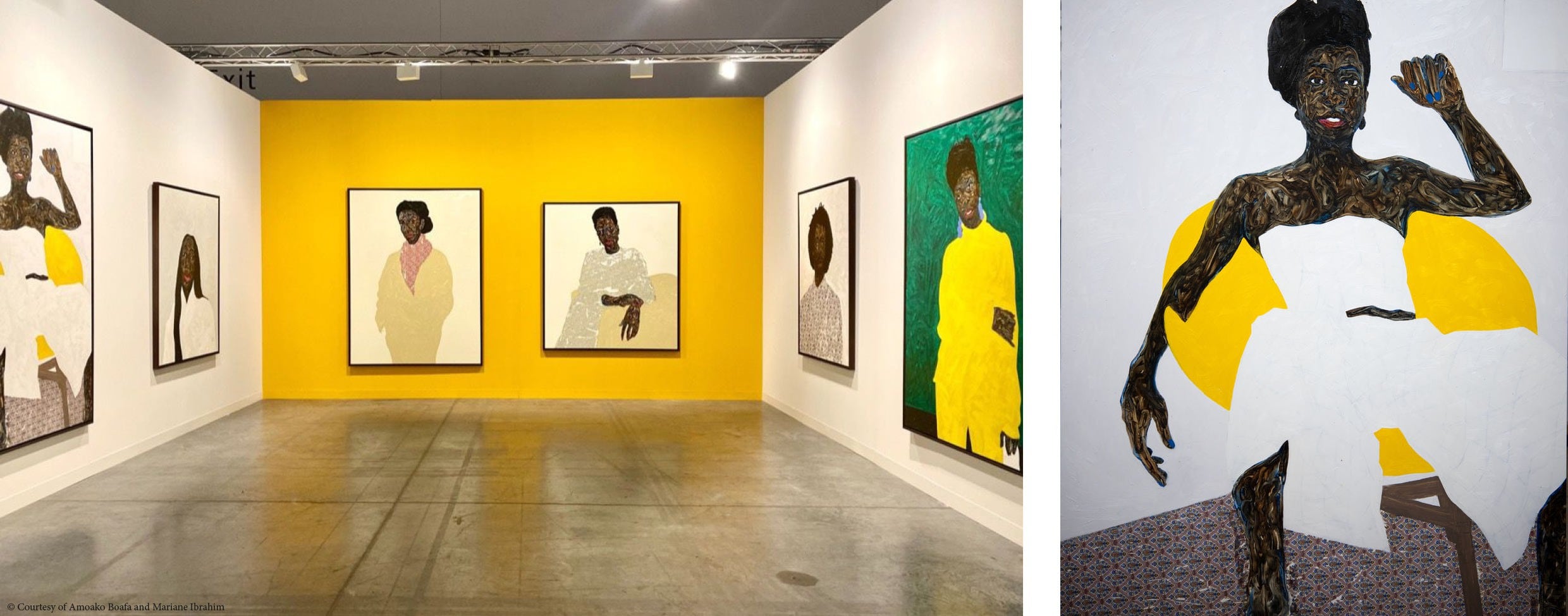 De Ghanese schilder Amoaka Boafo was een enorm succes. Met zijn prachtige schilderijen onderzoekt hij de relatie tussen het persoonlijke en het structurele door ‘zwarte’ subjectiviteit en zorg centraal te stellen. Er werden zes van zijn schilderijen tentoongesteld op de beurs door galeriehouder Mariane Ibrahum en ze werden allemaal verkocht.