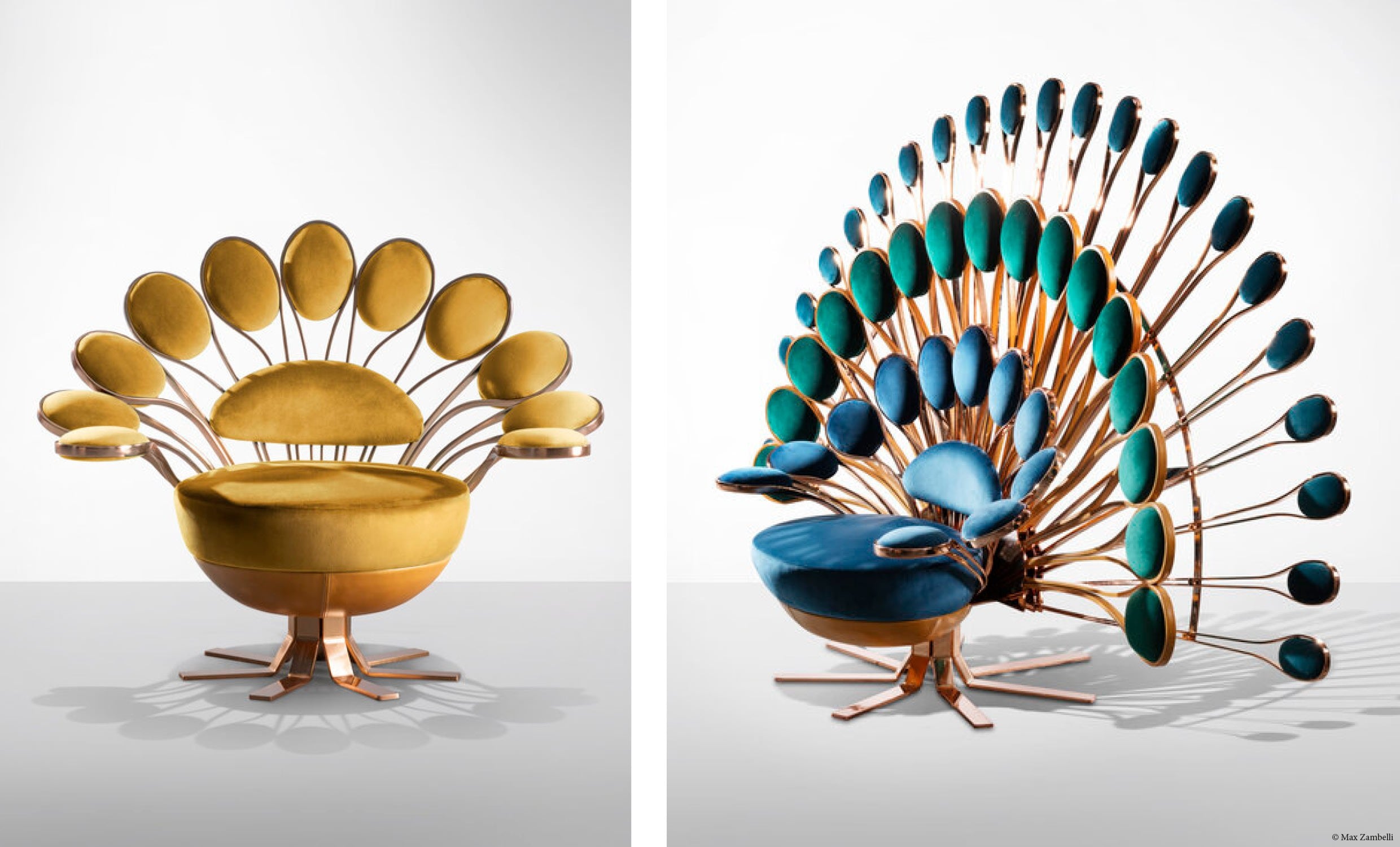 Als tweede waren we grote fan van Marc Anges ‘Garden of Beauty’. Hij stelde hier zijn ‘Il Pavone’-reeks voor. Een serie prachtige, weelderige stoelen die je meteen in een tropische sfeer brengen. Je ziet meteen aan de vorm en kleuren dat de meubels geïnspireerd werden door de sierlijke pauw. Deze meubels zijn zowel praktisch als decoratief en zijn zonder twijfel dé eyecatcher in elke ruimte.