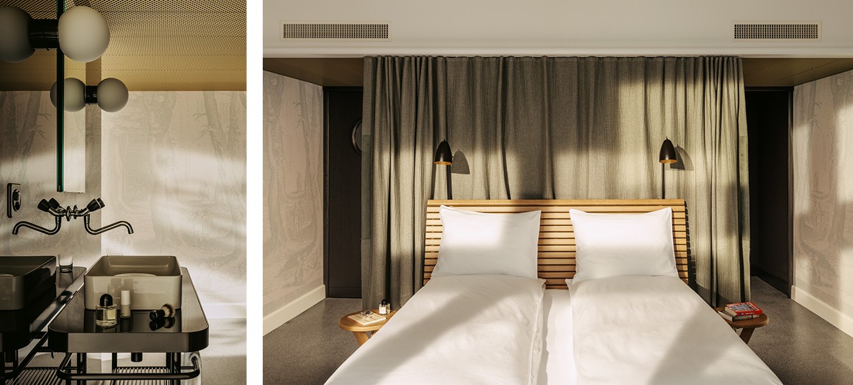 De opbergruimte-badkamer hybride werd geïnspireerd op de layout van de voormalige kantoorruimtes en de oude zolderkamers. Dit element is een brede opbergruimte die de gang en de hotelkamer van elkaar scheidt. Het heeft een dubbele functie, het dient namelijk als een kast en als badkamer. Het kleurenpalet in de hotelkamers is sober. De architecten kozen zwart gebeitst eikenhout voor het volume van de badkamer en opbergruimte en donkere terrazzo vloeren. Andere materialen en kleuren blijven neutraal van zachtgroen tot gebroken wit en de meeste meubels komen uit Hertzog & de Meurons eigen collectie. Bijkomend werd de lobby ontworpen als een tegenhanger van de donkere bar. Deze kreeg een licht kleurenpalet en kan ook dienen als een expositieruimte.